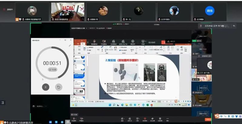 竞赛分为四个阶段,每阶段各参赛队伍分别扮演正方、反方、评论方、观摩方的不同角色,并按顺序依次进行自我介绍。比赛正式开始,正、反、评三方主控队员依次通过共享屏幕进行报告和讨论。正方就实验设计、实验结果、理论分析以及讨论和结论等进行重点讲解,反方就正方陈述中的弱点或者谬误提出质疑,总结正方报告的优点与缺点,评论方对正反方的陈述给出简短评述。在每一阶段的比赛中,每支队伍只能由一人主控发言,其他队员做协助工作。各参赛队伍根据竞赛方案进行角色循环来完成四个阶段的团队辩论赛。比赛过程中,队员们各抒己见、友好讨论,结合专业知识,尽情展示风采,力求共同提高。