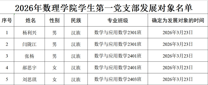 为严格遵循发展党员工作程序,严把党员入口关,确保新党员发展质量,经个人申请、培养联系人推荐、党支部委员会审查,并经支部党员大会讨论通过,现将2026年度上半年5名发展对象推选结果名单公示如下。